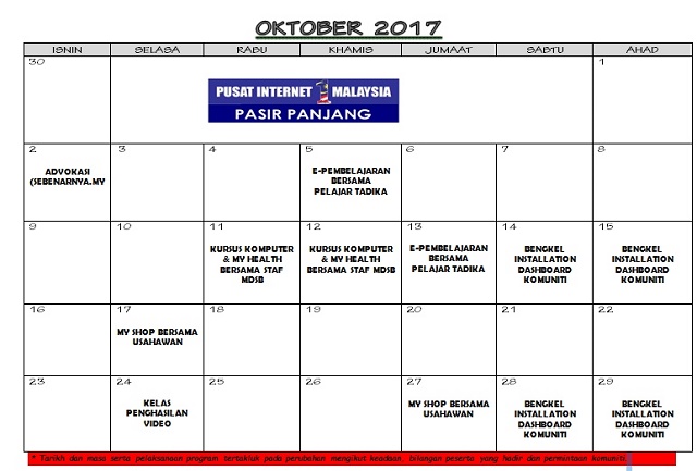 JADUAL AKTIVITI BULAN OKTOBER 2017