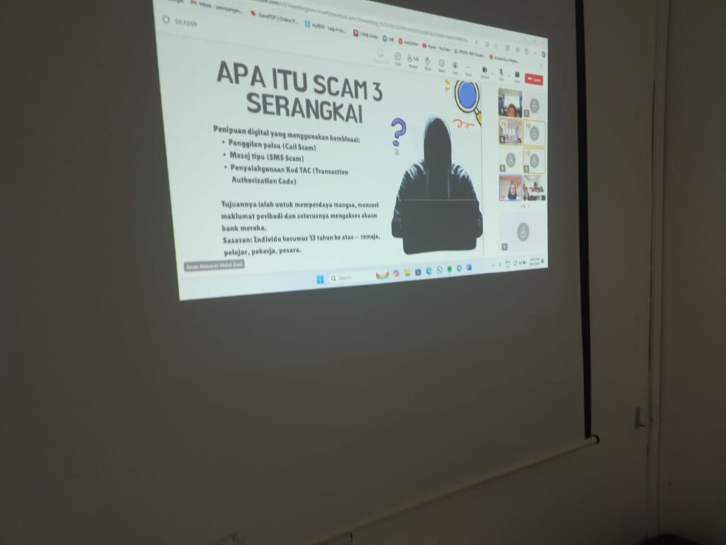 | Aktiviti Sesi taklimat oleh pakar keselamatan siber, simulasi penipuan sebenar, perkongsian kisah mangsa, sesi soal jawab interaktif, dan pemberian panduan serta tips keselamatan digital untuk melindungi diri daripada scam. |